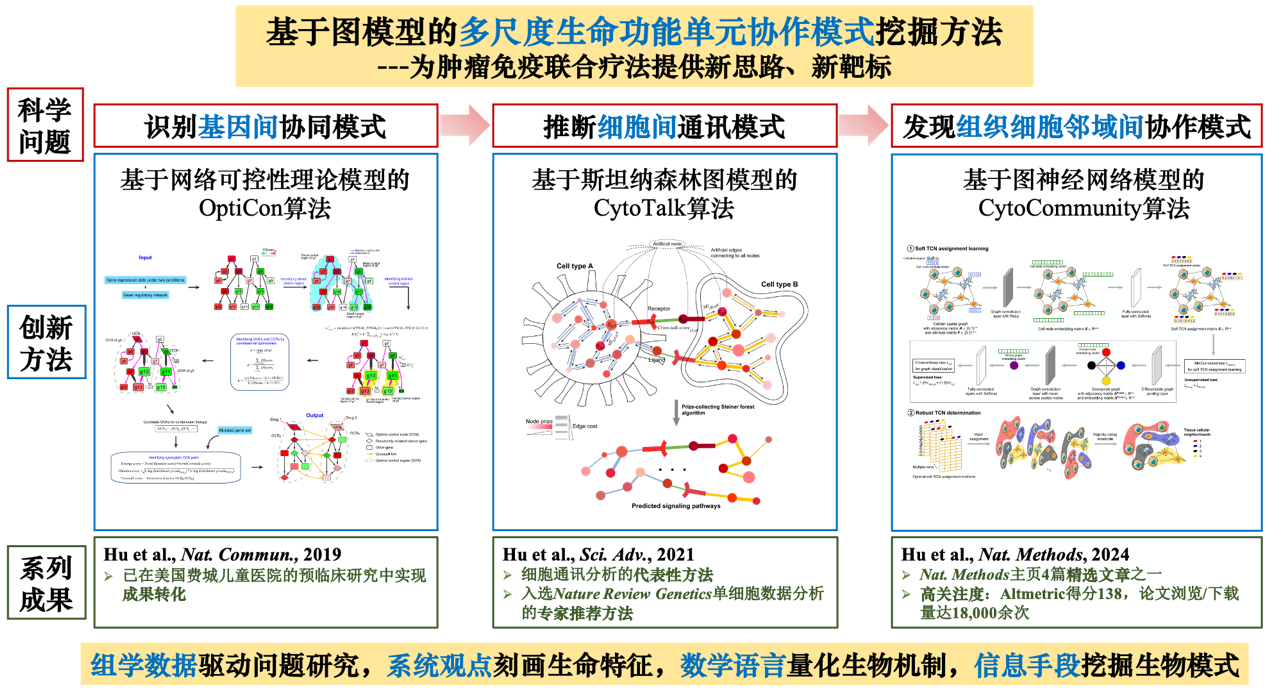 以“面向人民生命健康”为导向,在分子组学大数据驱动下,长期以图理论与复杂网络为基础,重点研究基于图模型的基因间、细胞间、组织细胞邻域间协作模式挖掘方法,为肿瘤靶向/免疫疗法的研发提供新思路、新靶标。取得了具有国际影响力的系列成果:构建了基于网络可控性理论的关键调控因子及其协同组合识别算法OptiCon,在费城儿童医院预临床研究中获得成果转化应用;建立了细胞通讯信号转导网络的从头构建算法CytoTalk, 被评价为“细胞通讯分析”四种代表性方法之一,入选《Nature Review Genetics》单细胞数据分析的专家推荐方法;提出了基于弱监督学习的条件特异性组织细胞邻域及其协作模式识别算法CytoCommunity,是第一个对单细胞空间图谱可以同时做无监督和有监督学习的计算方法,为解析肿瘤-免疫互作机制提供分析工具。代表性成果发表在《Nature Methods》(精选文章)、《Science Advances》和《Nature Communications》。